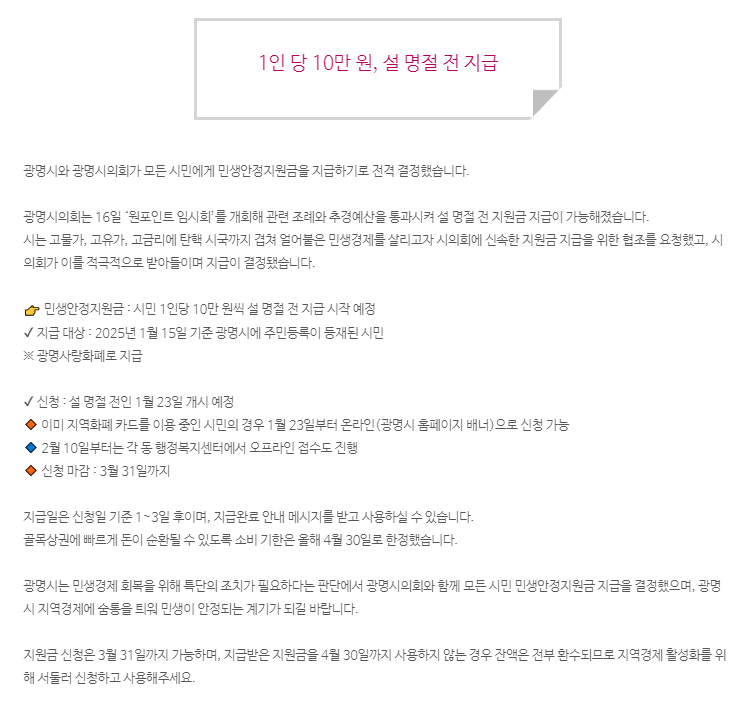 2025년 광명시는 설 명절을 앞두고 민생안정지원금을 지급하여 시민들의 경제적 부담을 덜어주고자 합니다. 이번 지원금은 신청 방법이 간단하고 광명사랑화폐로 지급되어 지역 경제 활성화에도 기여할 예정입니다. 이 글에서는 지급 대상부터 신청 방법, 지급 시기, 사용처, 주의사항까지 하나씩 알아보겠습니다.