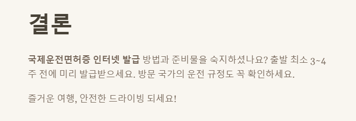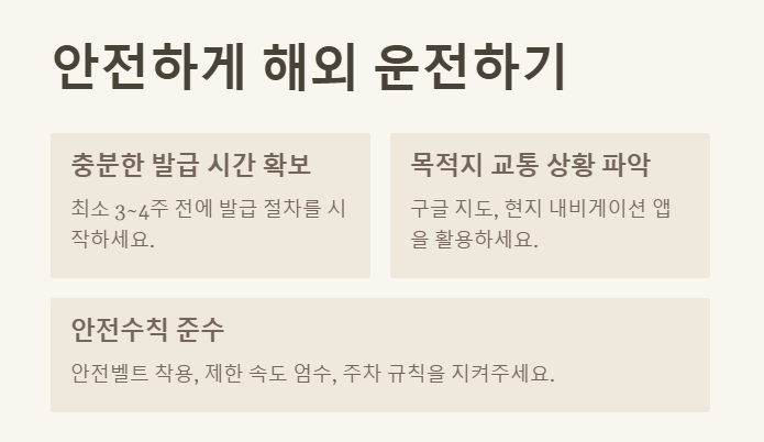 해외 출국을 앞두고 운전을 계획하고 있다면, 출발 최소 3~4주 전에 미리 발급을 받아두는 것이 좋습니다. 아울러 방문 국가의 운전 규정과 면허 사용 조건을 반드시 확인하여, 안전하고 편리하게 해외 운전을 즐기시길 바랍니다.