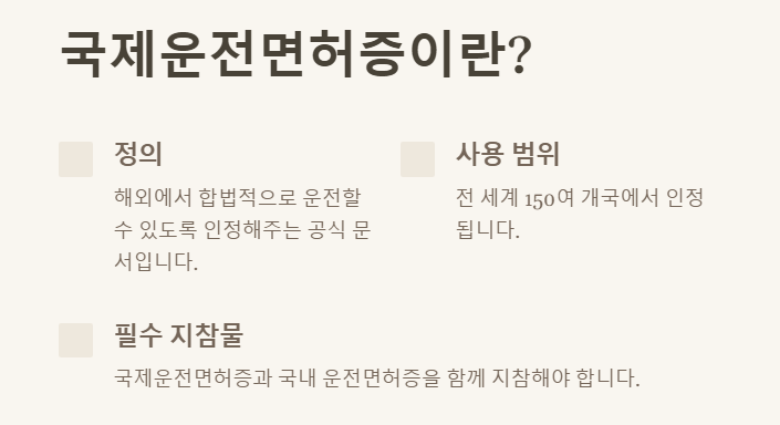 국제운전면허증은 해외에서 합법적으로 운전할 수 있도록 인정해주는 공식 문서입니다.