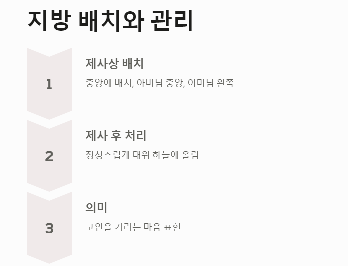 저는 처음 지방을 쓸 때 "이렇게 해야 하는 이유가 뭘까?"라는 궁금증이 많았어요. 그런데 지방을 직접 써보니, 고인을 기리는 제 마음가짐이 더 진지해지더라고요. 결국 지방은 단순히 글씨를 적는 게 아니라, 정성과 마음을 담는 것이 가장 중요한 작업이라는 걸 알게 되었죠.