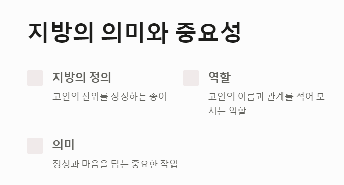 먼저, 지방이 무엇인지 간단히 짚고 넘어갈게요. 지방(紙榜)은 제사에서 고인의 신위를 상징하는 종이입니다. 쉽게 말하면, 고인의 이름과 관계를 적어 고인을 모시는 역할을 한다고 보면 됩니다.
