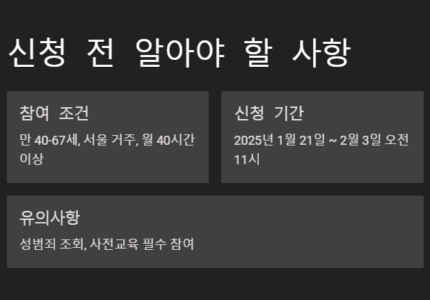 (※ 정부 일자리사업에 이미 참여 중이더라도, 활동에 지장이 없다면 중복 지원 가능) - 추가 유의: 성범죄 및 아동학대 관련 조회 시 결격사유가 없어야 하며, 사전교육(온라인·오프라인)에 필수로 참여할 수 있어야 합니다.