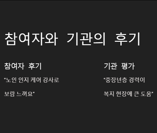 “처음에는 온라인 신청이 어려웠는데, 가족의 도움으로 신청 과정을 무사히 마칠 수 있었습니다. 지금은 노인 인지 케어 강사로 활동하고 있는데, 어르신들이 즐거워하시는 모습을 보며 보람을 느끼고 있어요.”