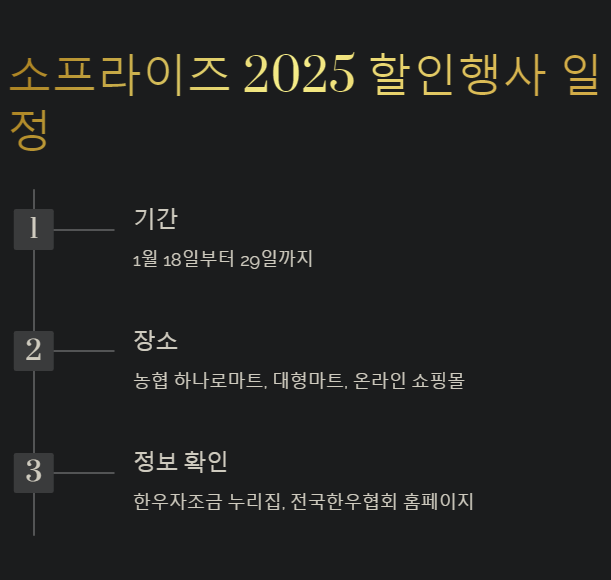 설 명절이 코앞으로 다가왔습니다! 가족들과 풍성한 식탁을 차릴 준비, 아직 못하셨다면 주목하세요! 2025년 새해 첫 대규모 할인행사 "소프라이즈 대한민국 한우세일"이 시작됩니다. 이번 행사는 한우를 사랑하는 국민들에게 반가운 소식으로, 전국 1800여 개 온·오프라인 매장에서 한우를 최대 50% 할인된 가격에 만나볼 수 있습니다.