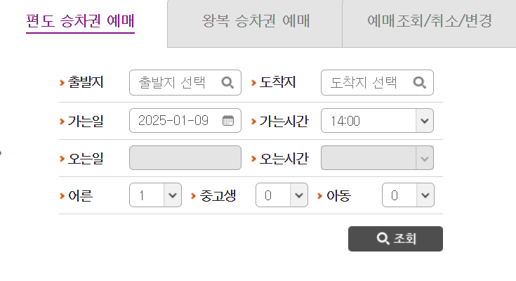 - 출발지, 도착지, 출발 날짜, 시간 입력 후 검색