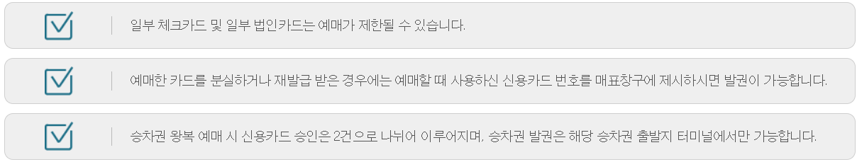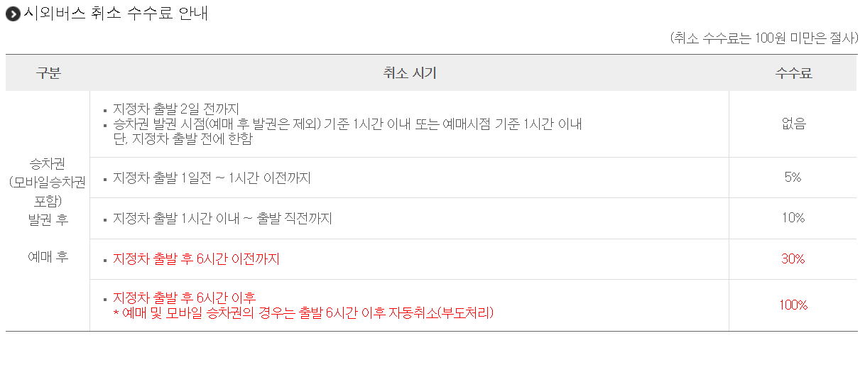 👉 알림: 예매 및 모바일 승차권의 경우, 출발 후 6시간이 지나면 자동 취소 처리(수수료 100%)됩니다.