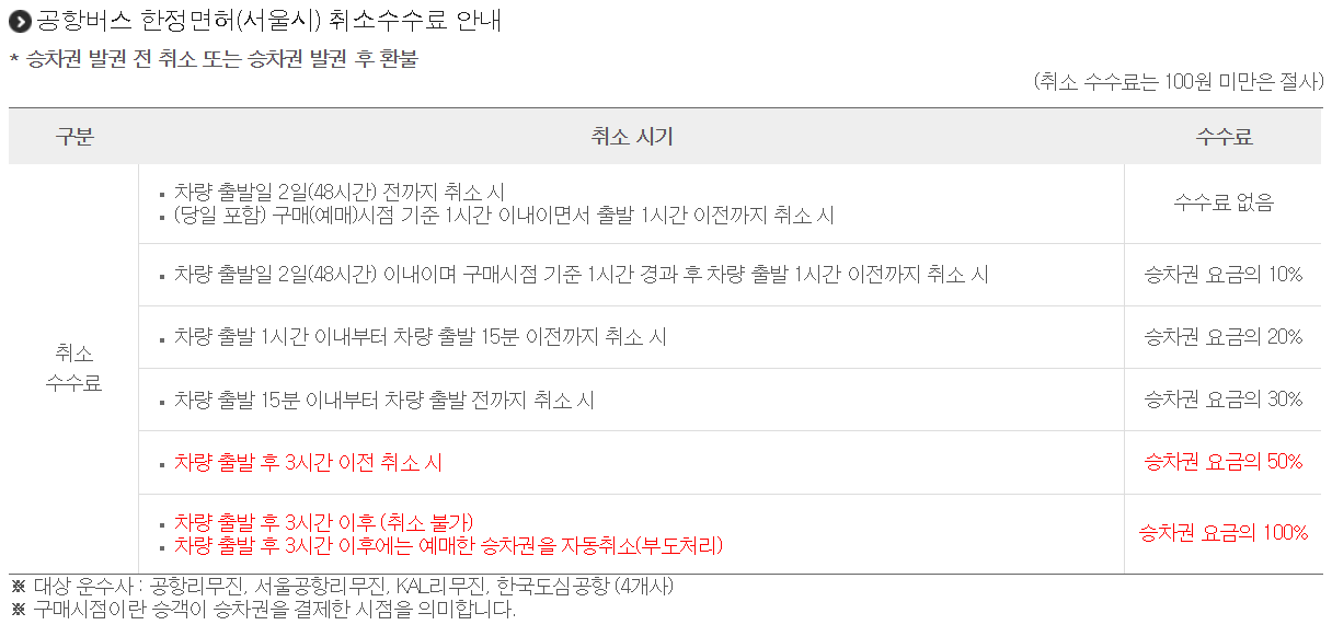 - 출발 1시간 전까지: 일부 수수료 부과(5~10%)