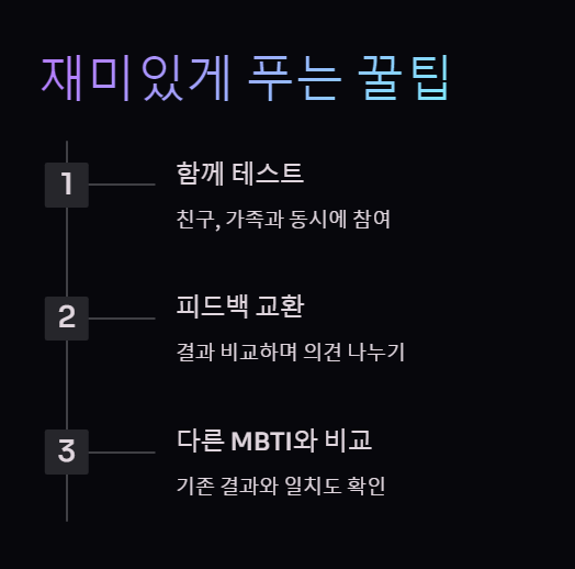 - 기존 MBTI 테스트 결과와 얼마나 일치하는지 살펴보세요. 의외로 정확해 깜짝 놀랄 수도 있어요.