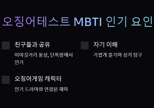 둘의 시너지가 합쳐지면서 “나의 성격이 오징어게임에서 어떤 캐릭터일까?”라는 흥미로운 상상이 가능해졌고, 이로 인해 오징어테스트 MBTI가 급부상하게 되었습니다.