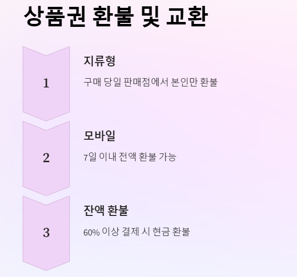 - 사용 후 잔액 환불: 결제 금액의 60% 이상 결제 시 잔액 현금 환불 가능