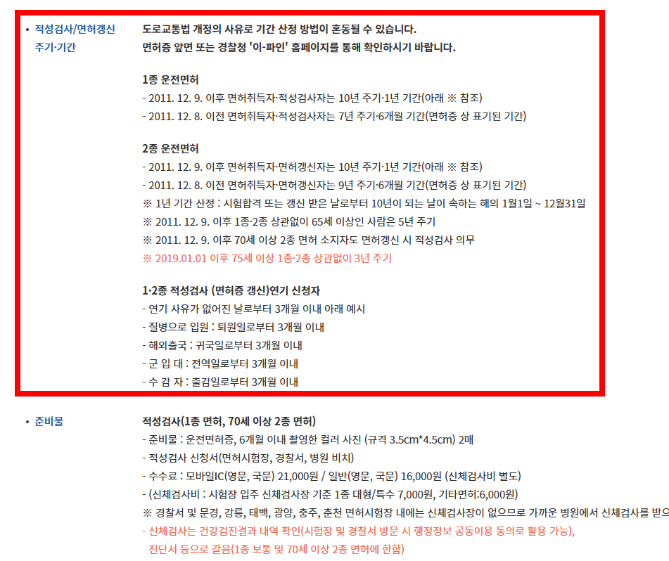- 2011년 12월 9일 이후 취득자/적성검사자: 10년 주기 / 1년 기간