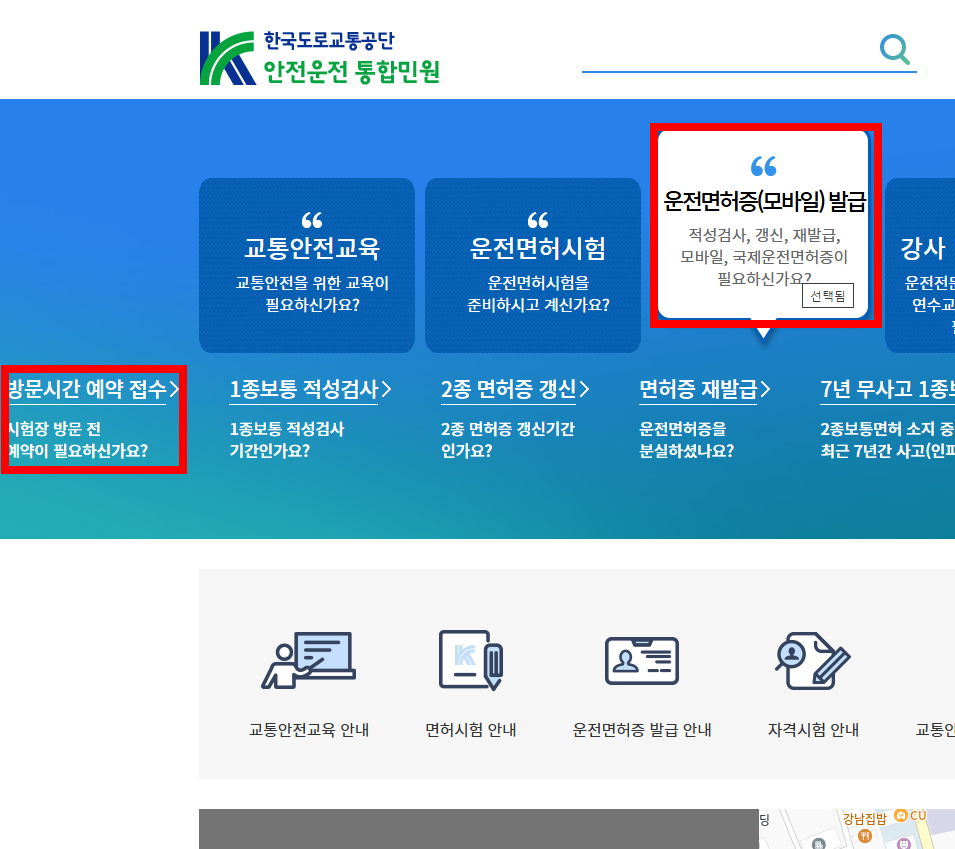 - '운전면허증(모바일) 발급' → '방문시간 예약 접수' 메뉴 선택