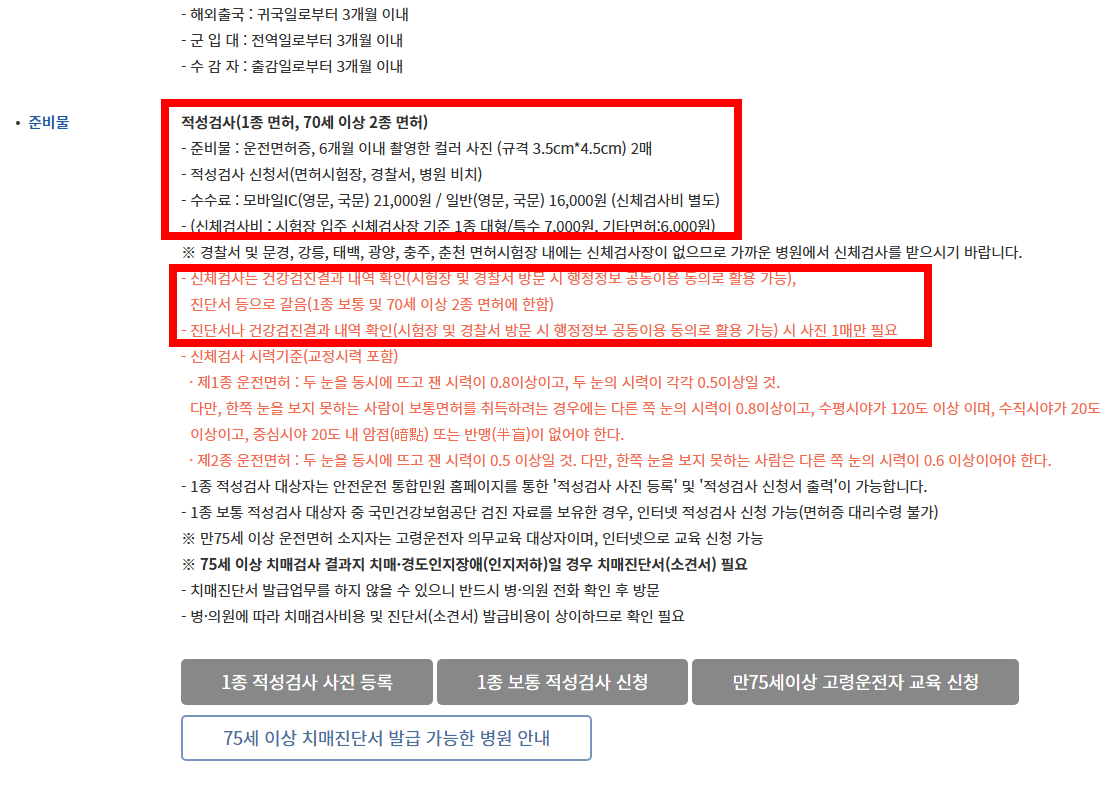- 1종 면허 및 적성검사 대상자는 신체검사 증빙 필요