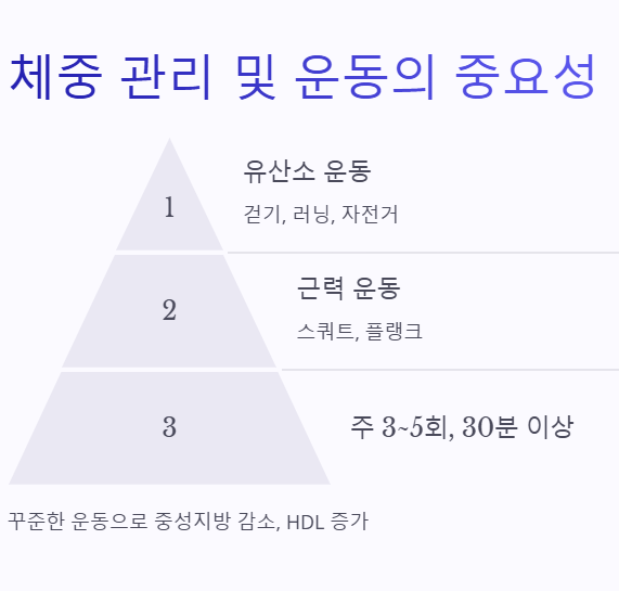 꾸준한 운동은 중성지방 수치를 낮추고, HDL 콜레스테롤 수치를 높이는 데 기여합니다.