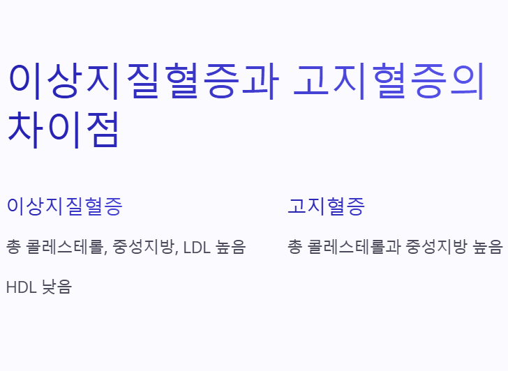 이상지질혈증은 총 콜레스테롤, 중성지방, LDL(나쁜 콜레스테롤) 수치가 높거나 HDL(좋은 콜레스테롤) 수치가 낮은 상태를 의미하며, 고지혈증은 그중에서도 총 콜레스테롤과 중성지방 수치가 높아지는 경우를 지칭합니다.