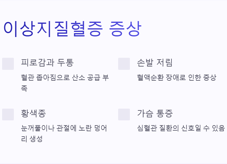 이상지질혈증은 혈액 내 지질 수치의 이상으로 발생하지만, 대부분 특별한 자각 증상이 없어 침묵의 살인자라고 불립니다. 하지만 다음과 같은 증상이 나타난다면 주의해야 합니다.