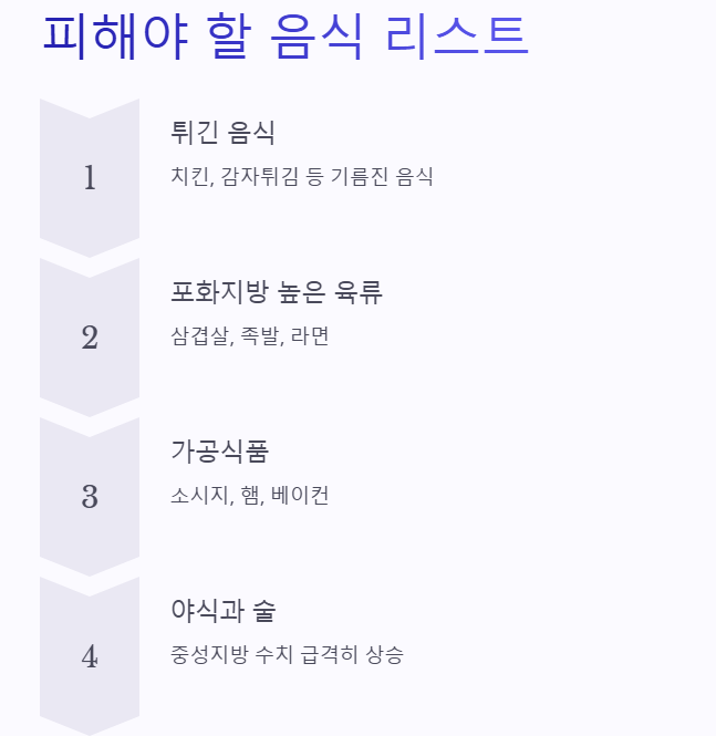- 포화지방이 높은 육류: 삼겹살, 족발, 라면 등
