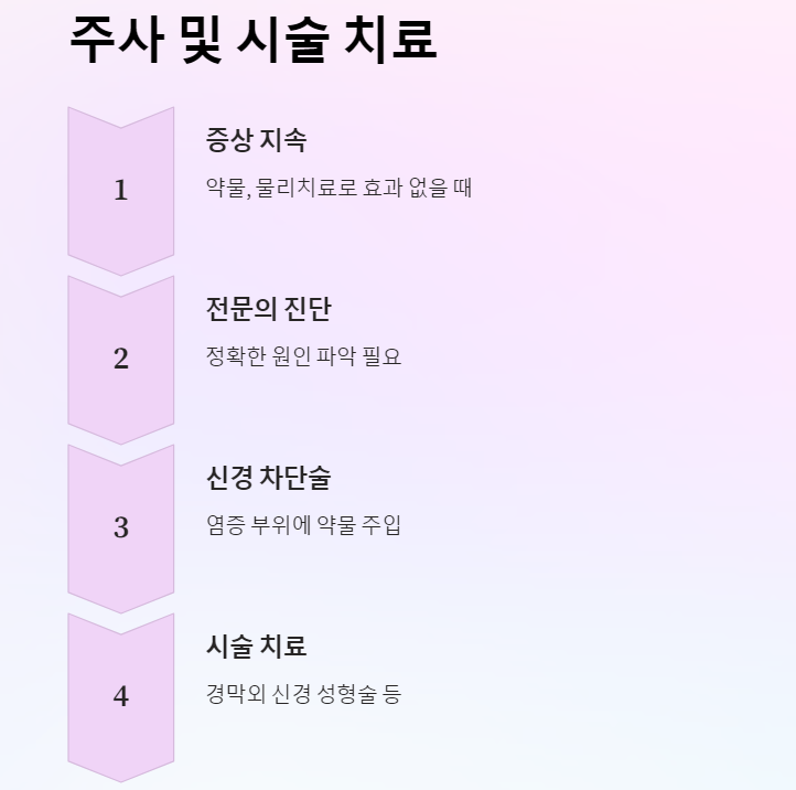 - 신경 차단술: 염증 부위에 약물을 주입해 통증을 줄이는 치료법입니다.