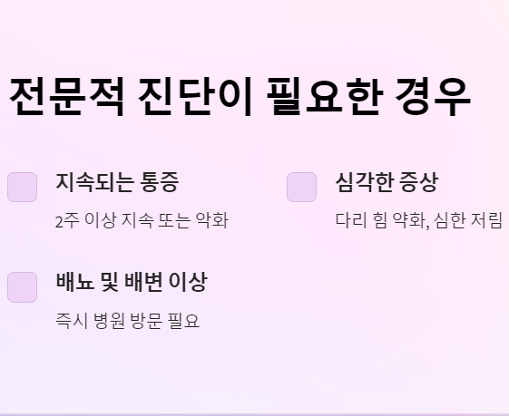 - 걷거나 오래 앉아 있을 때 악화되는 통증