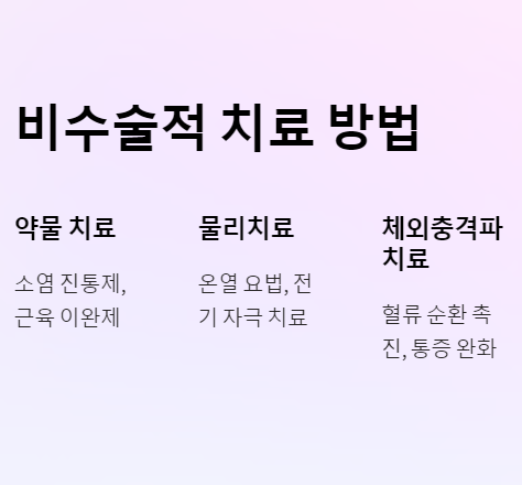 - 비수술적 치료: 약물 치료, 물리치료, 체외충격파 치료, 스트레칭 등