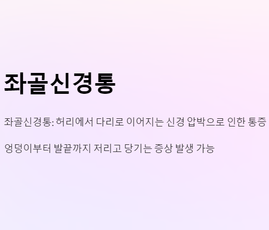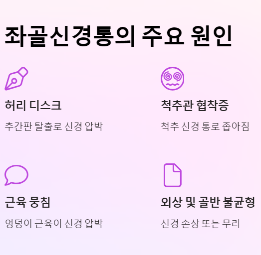 A1. 좌골신경통은 허리에서 엉덩이, 다리까지 이어지는 좌골신경이 자극을 받아 발생하는 통증입니다. 주로 허리 디스크, 척추관 협착증, 근육 뭉침 등으로 인해 신경이 압박되면서 엉덩이부터 다리까지 저리고 당기는 통증이 나타납니다.