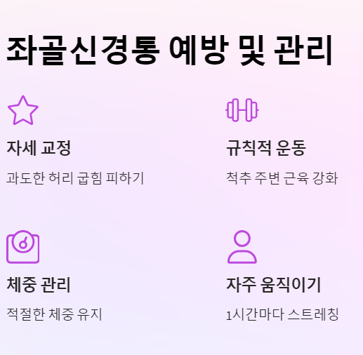 좌골신경통은 허리부터 다리까지 영향을 미치는 질환이지만, 초기 대처와 생활 습관 개선으로 충분히 개선할 수 있습니다. 오늘 소개해 드린 치료 방법과 예방 습관을 실천해 보세요. 통증이 심하다면 전문의의 진료를 통해 상태에 맞는 치료를 받는 것이 가장 중요합니다.
