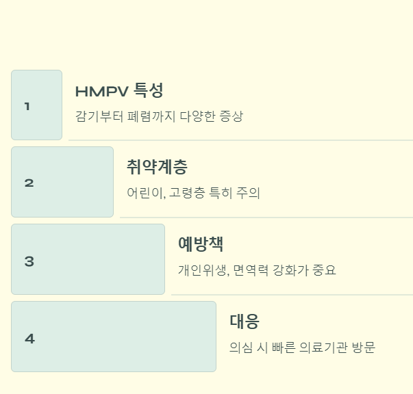 HMPV는 일반적인 감기 증상부터 폐렴과 같은 심각한 질환으로 이어질 수 있는 호흡기 바이러스입니다. 특히 어린이와 고령층은 감염에 취약하므로 예방 수칙을 철저히 준수하는 것이 중요합니다.