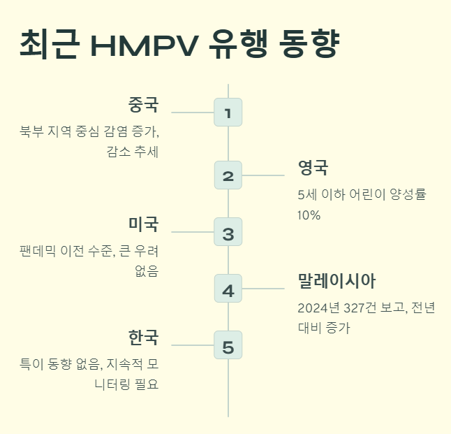 중국 호흡기 전염병(HMPV)는 전 세계적으로 발생하는 호흡기 바이러스로, 최근 일부 국가에서 감염 사례가 증가하고 있습니다. 아래는 주요 국가들의 HMPV 유행 상황에 대한 최신 정보입니다.