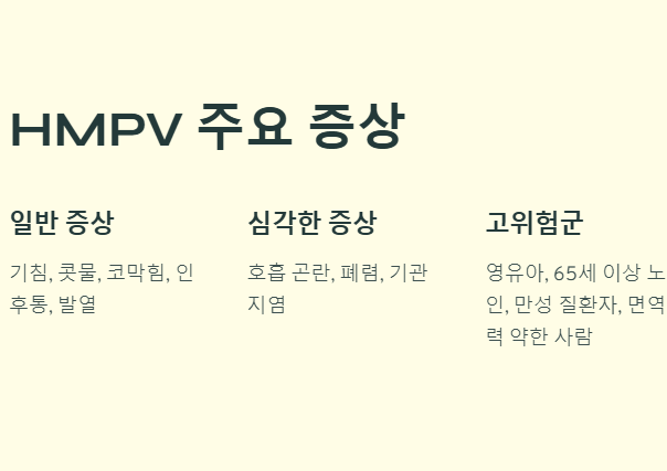 HMPV 감염 증상은 경증에서 중증까지 다양하며, 고위험군에서는 심각한 합병증으로 이어질 수 있습니다.
