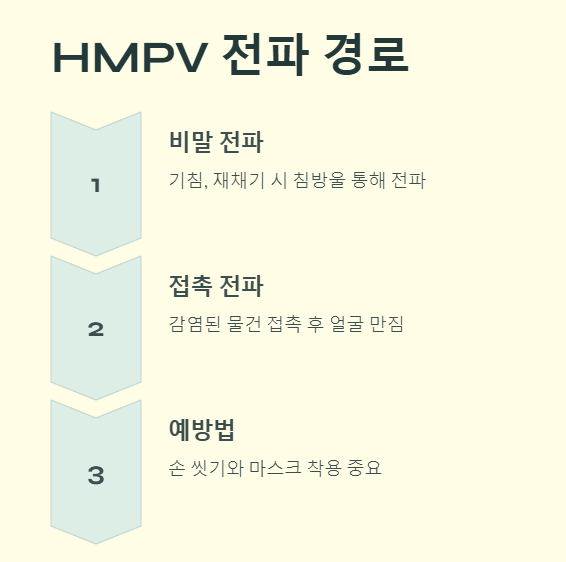 HMPV는 주로 공기 중 비말과 접촉을 통해 전파됩니다.