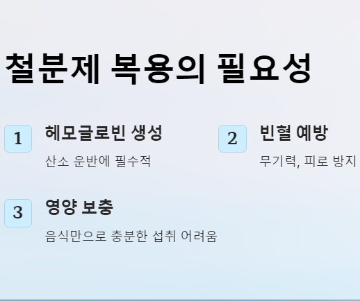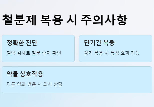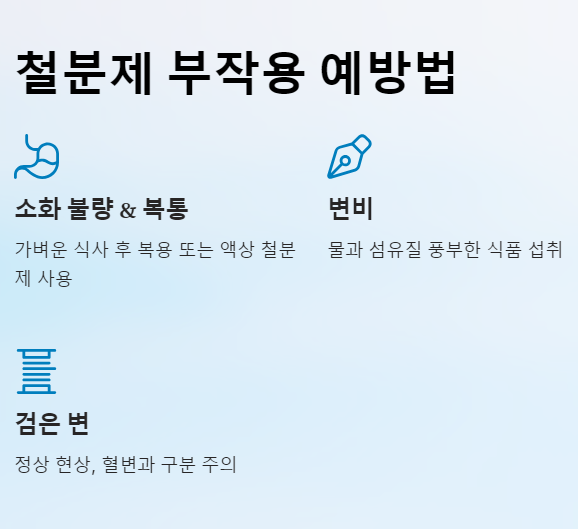 - 예방법: 정기 검사로 철분 수치를 확인하고, 권장량 이상 복용하지 마세요.