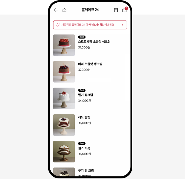 - 케이크 선택: 다양한 홀케이크 라인업 중 원하는 케이크를 선택합니다. 디자인, 크기, 가격 등을 비교하며 선택할 수 있습니다.