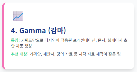 - 특징: 'AI 기반 프레젠테이션 자동 생성 툴'입니다. 몇 가지 키워드나 개요만 입력하면 AI가 알아서 디자인이 적용된 멋진 프레젠테이션, 문서, 웹페이지 초안을 만들어줍니다.