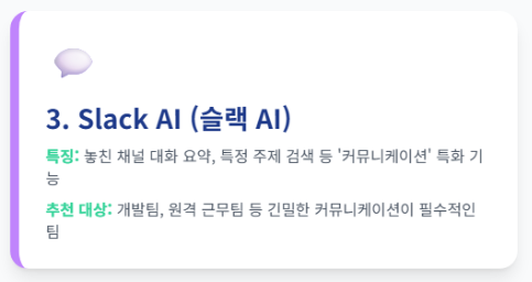 - 특징: 팀 커뮤니케이션의 중심인 Slack에 탑재된 AI입니다. 놓친 채널의 대화 내용을 요약해주거나, 특정 주제에 대한 논의를 찾아주고, 메시지 초안을 작성해주는 등 '커뮤니케이션'에 특화된 기능을 제공합니다.