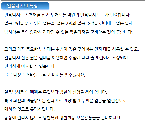 - 체험 내용: 얼음 위에 구멍을 뚫고 산천어를 낚는 체험으로, 낚은 산천어는 현장에서 회, 구이로 바로 즐길 수 있습니다.