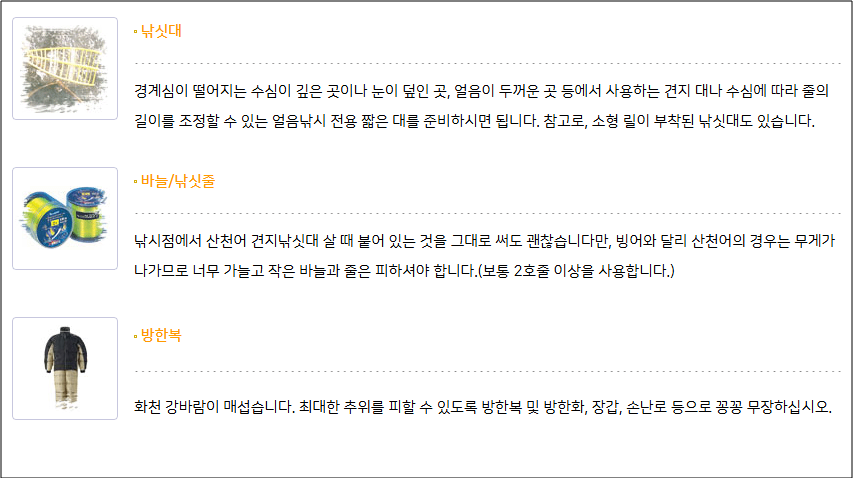 A: 네, 낚싯대, 얼음뜰채 등 기본 용품은 현장에서 대여할 수 있습니다.