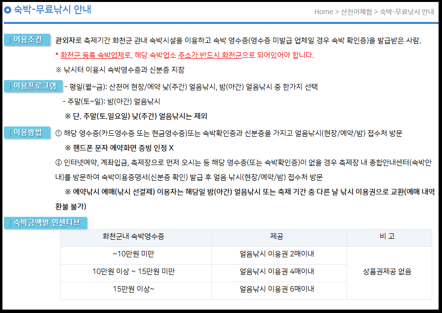 - 화천군 내 숙박 시 영수증 지참 시 얼음낚시 무료 체험권 제공