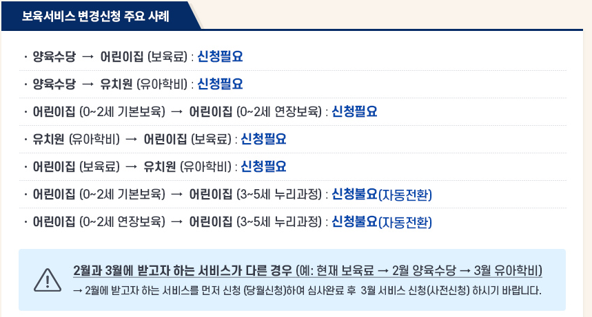 어린이집, 유치원, 가정양육으로 변경하는 경우 필수적으로 신청이 필요합니다.