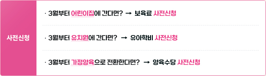 | 사전신청 | 3월부터 어린이집·유치원·가정양육 예정 | 2월 3일 ~ 2월 28일 | 3월부터 적용 |