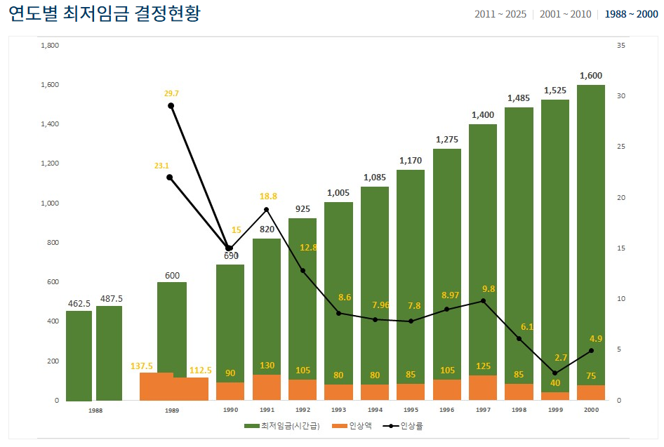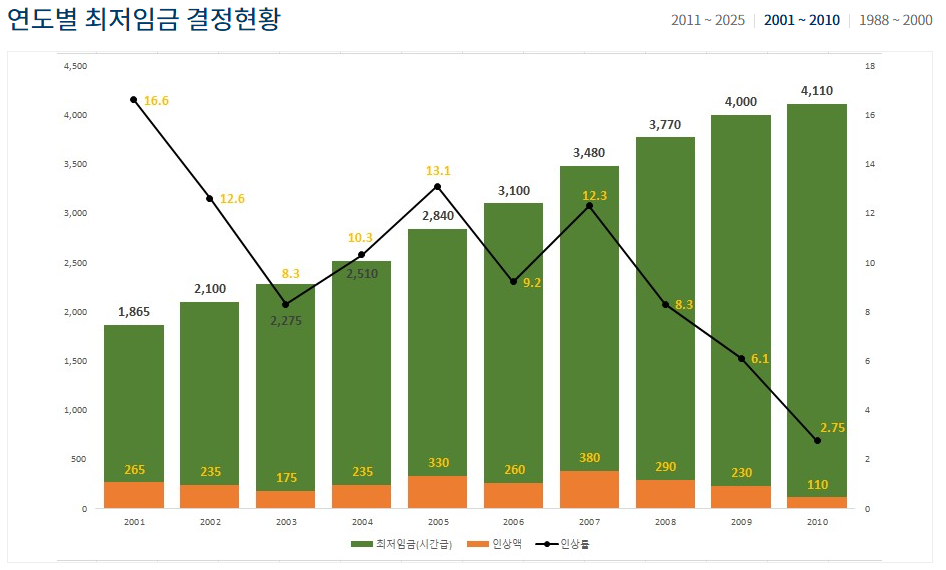 | 연도 | 최저임금 (시급) | 인상률 |