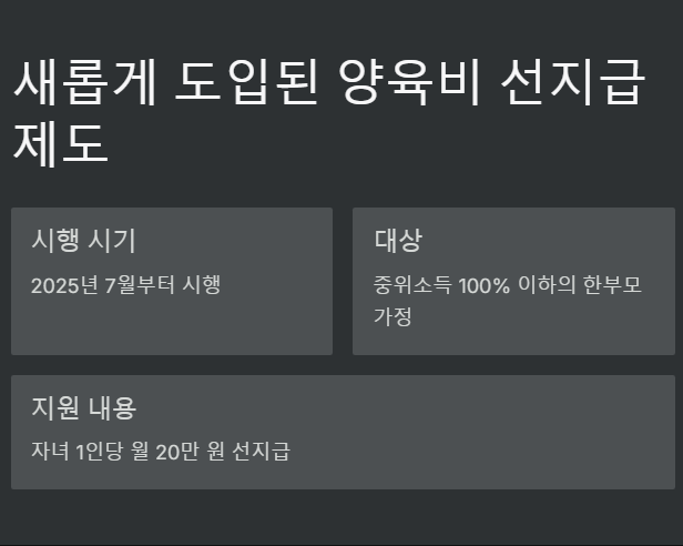 A2. 양육비 선지급 제도는 2025년 7월부터 시행됩니다. 중위소득 100% 이하의 한부모 가정이 대상이며, 자녀 1인당 월 20만 원을 정부가 선지급합니다.