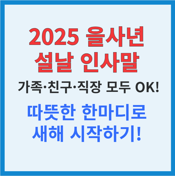 2025년 을사년 설날에는 마음을 담은 따뜻한 인사말로 사랑과 감사의 마음을 전해 보세요. 짧지만 진심 어린 한마디가 큰 감동을 줄 수 있습니다. 다양한 상황에 맞는 인사말을 참고해 나만의 메시지를 준비해 보세요. 새해 복 많이 받으시고, 풍요롭고 행복한 한 해 되세요!