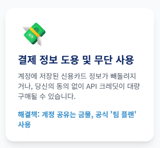 - 상황: ChatGPT 유료 플랜을 구독하기 위해 등록해 둔 당신의 신용카드 정보가 계정 설정에 저장되어 있습니다. 계정을 공유하는 누군가가 이 정보를 빼돌려 다른 유료 사이트에서 사용하거나, 당신의 동의 없이 API 크레딧을 대량으로 구매하여 '요금 폭탄'을 안겨줄 수 있습니다.