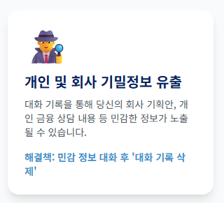 - 해결책: 계정 공유를 즉시 중단하고, 불가피하게 공유해야 한다면 민감한 정보에 대한 대화 후에는 반드시 '대화 기록 삭제(Clear conversations)' 기능을 사용하는 습관을 들여야 합니다.