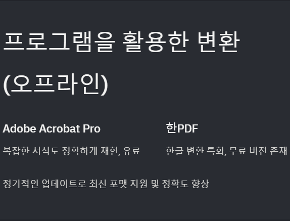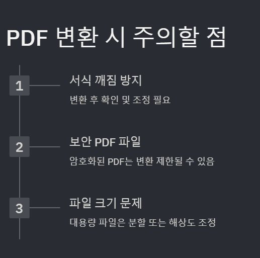 - 그래도 해결이 어렵다면 Adobe Acrobat Pro와 같은 고급 프로그램으로 먼저 변환해보고, 필요한 경우 수동으로 서식을 재정비하는 것이 좋습니다.