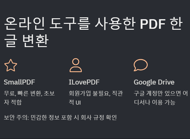 - 회원가입이나 설치 과정 없이 빠른 결과를 얻을 수 있는 SmallPDF, ILovePDF, Google Drive 같은 온라인 도구를 추천합니다.