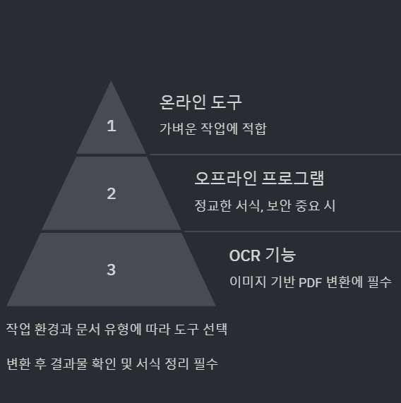 PDF파일을 한글파일로 변환을 위한 다양한 방법을 살펴봤습니다. 문서 종류, 보안 이슈, 서식 복잡도 등에 따라 선택할 수 있는 도구가 달라집니다.